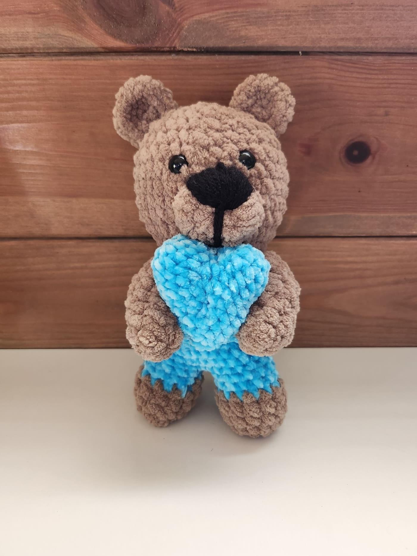 Aranyos, kézzel horgolt macis figura világoskék kantáros ruhában, szívecskével a kezében. Kézműves ajándék, amely örömet szerez kicsiknek és felnőtteknek egyaránt.